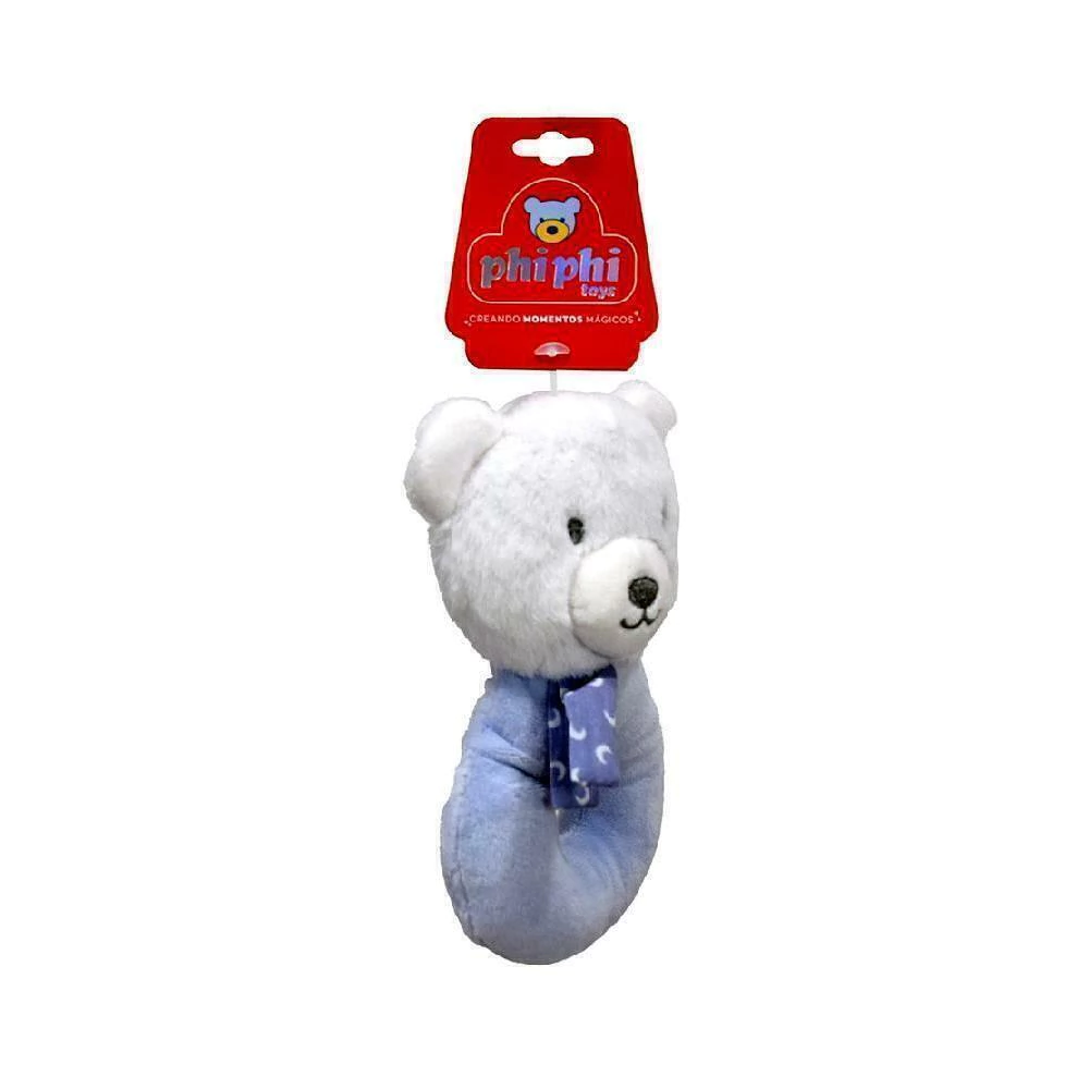 Peluche oso con sonajero incorporado y diseño ergonómico para pequeñas manos. Materiales suaves y seguros para bebés.